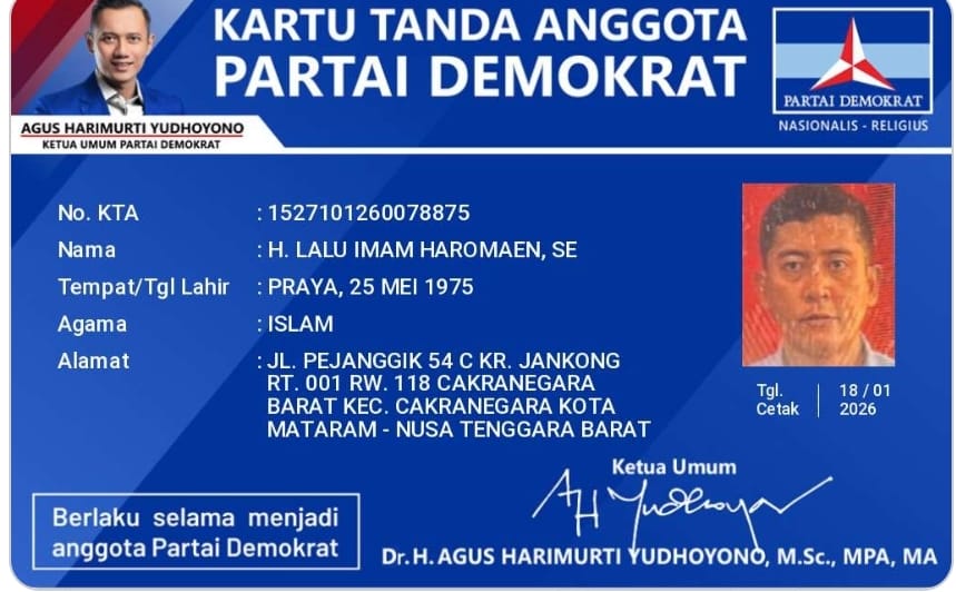 KTA tersebut dibubuhi lengkap dengan tanda tangan Ketua Umum Partai Demokrat Agus Harimurti Yudhoyono. KTA bernomor 1527101260078875 itu dicetak pada tanggal 18 Januari 2026 yang lalu.